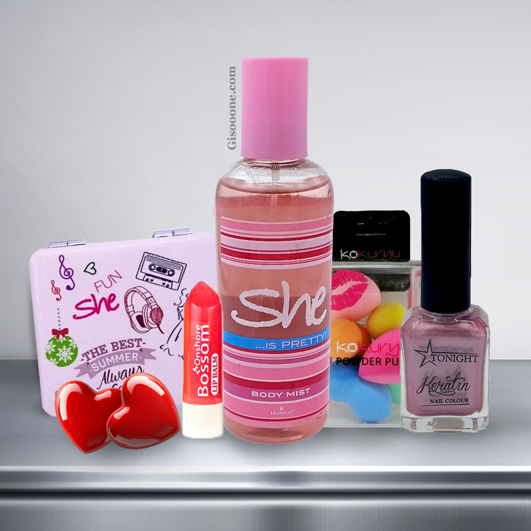 بادی میست و آینه کیفی مدل پرتی برند شی ، لاک تونایت ، بالم لب قرمز بوسوم ، بیوتی بلندر رنگی