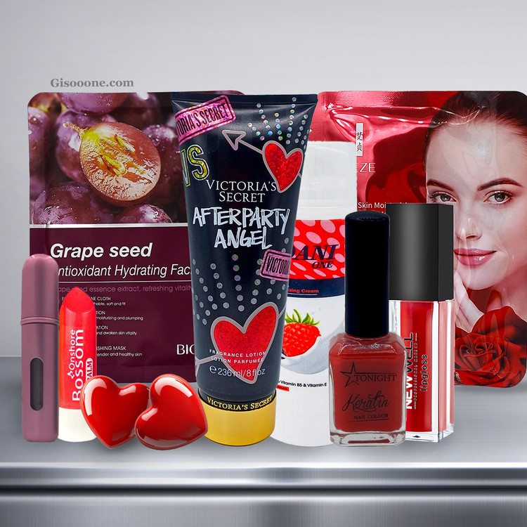 ماسک ورقه ای انگور سیاه برند بیو آکوا ، ماسک صورت ورقه ای سیب قرمز برند ونزن ، لوسیون بدن ویکتوریا سکرت ، کرم مرطوب کننده دنی وان ، بالم لب بوسوم ، خط چشم رنگی قرمز برند هندایان ، بادی میست برند شی ، رژلب مایع مات قرمز برند نیوول